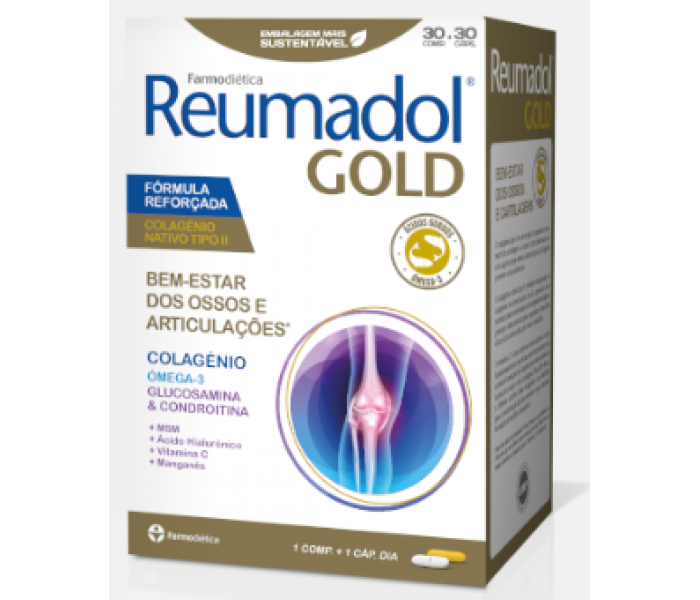 Reumadol Gold é um suplemento alimentar que contém um complexo de glucosamina, condroitina, mentil-sulfonil-metano (MSM), colagénio, ácido hialurónico, silício, quercetina, alto teor de vitamina C e manganês.
